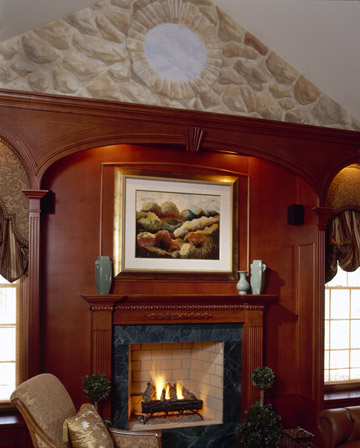 The custom fireplace of solid cherry, accented by marble tiles, sets the mood for this cozy library.