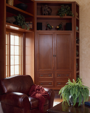 This close-up provides a view of the units’ clean lined cabinet and many shelves for display.