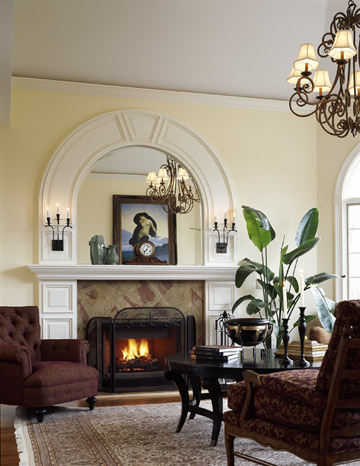 room. The arched fireplace surround, playing off of the arched windows,
