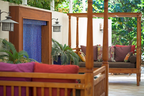 A whimsical feel is created by Indonesian daybeds, that rest under a covered pergola, for an open and airy feel. The Asian inspired sconces, exotic plants, and cultural furniture add layers of interest to the villa. A place to relax with a book or enjoy an afternoon nap listening to the waterfall.