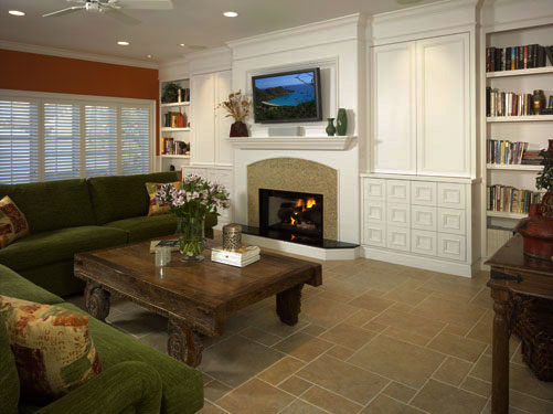 This vibrant environment creates a welcoming spot for gathering family and friends. Large, comfy sofas covered in a soft chenille provide a space to cozy up in front of the beautiful fireplace (which sparkles with small mosaic tile accents) or to kick back and relax in front of the wall mounted plasma TV. Custom built-ins are the perfect solution for storage and accessorizing, but more importantly add a detailed focal point to the room.