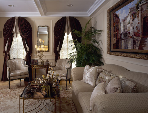 Elegance is brought into the interior with window treatments fabricated in lightweight velvet