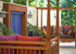 A whimsical feel is created by Indonesian daybeds, that rest under a covered pergola, for an open and airy feel. The Asian inspired sconces, exotic plants, and cultural furniture add layers of interest to the villa. A place to relax with a book or enjoy an afternoon nap listening to the waterfall.